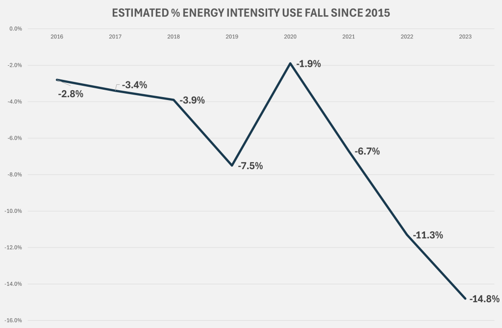 Absolute change matters because it reflects where the largest reductions in raw energy intensity have been achieved.