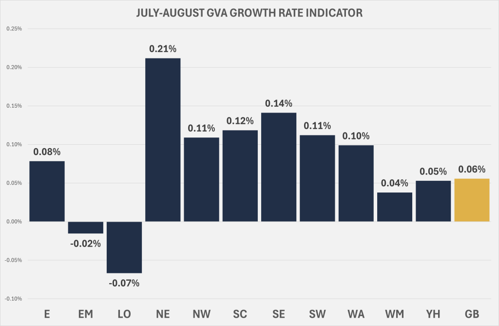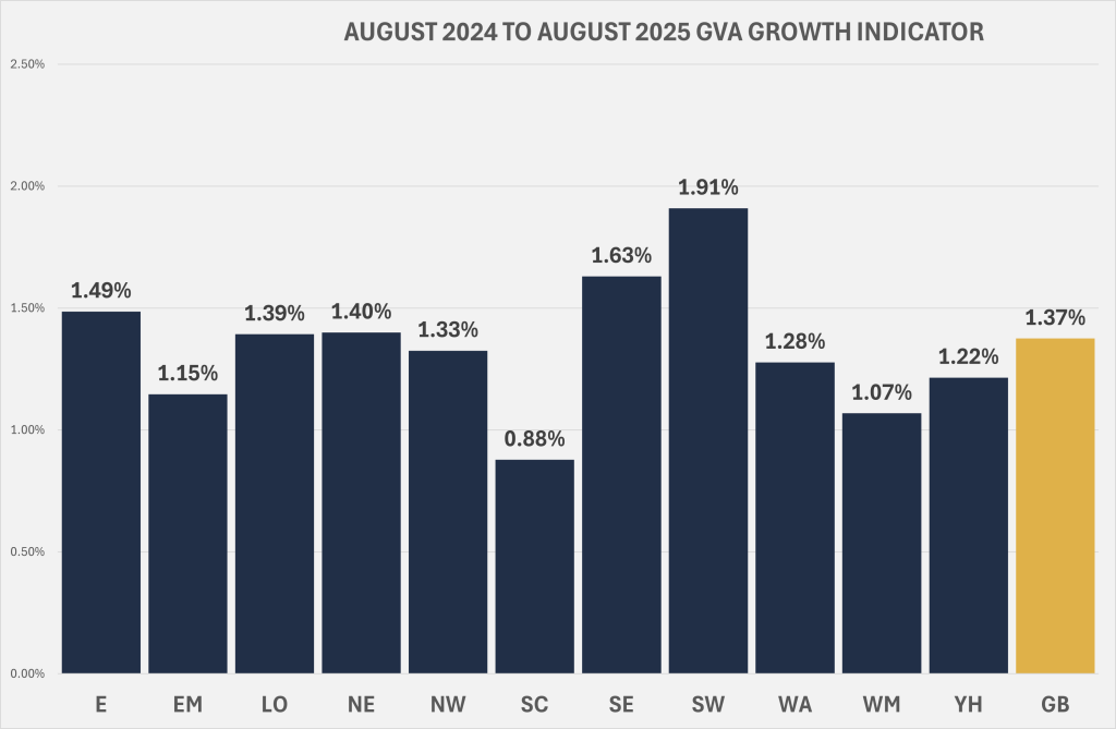 The chart below illustrates the year on year growth as of August 2025. The South West continues to perform strongest during this period, achieving growth of 1.91% against a GB average of 1.37%. Solid growth in defence-related sectors such as shipping and aerospace, along with health services and the rental and leasing sector helped the SW outperform the GB average. Scotland’s growth was estimated to be just 0.88% with refined petroleum and electricity production, linked to Grangemouth, both dampening growth. The West Midlands posted below average growth of around 1.07% with the motor industry significantly curtailing the growth rate.